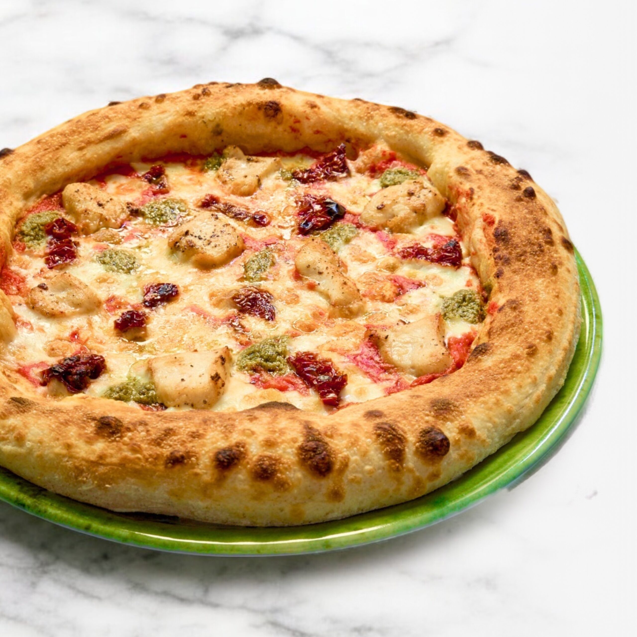 Klassikaline tomatikaste, mozzarella, suitsukana, päikesekuivatatud tomatid, basiiliku pesto